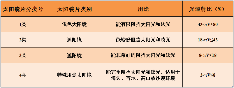 太陽眼鏡的鏡片分類一般分為1-4類(歐洲分為5類),這個(gè)分類是根據(jù)鏡片的可見光透射率來區(qū)分的。