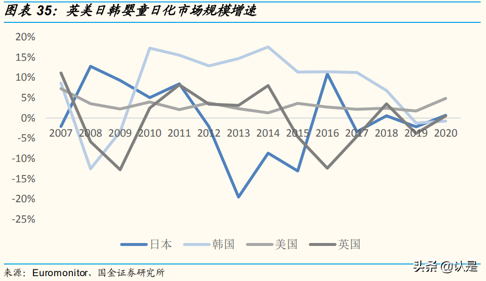 韓國嬰童日化行業(yè)格局近年發(fā)生變動,主要為行業(yè)成長,給品牌提供新的 成長機遇,如嬰幼兒敏感護膚品牌宮中秘策、專業(yè)嬰童敏感肌護膚品愛多康等 品牌近年市占率持續(xù)提升。相比英美日等成熟市場、行業(yè)格局較為穩(wěn)定,韓國 行業(yè)成長給品牌成長提供了前提條件。2006~2020 年韓國嬰童日化行業(yè)年均復(fù) 合增 7.45%,而同期日本、美國、英國分別復(fù)合降 0.64%、增 3.13%、降 0.51%。