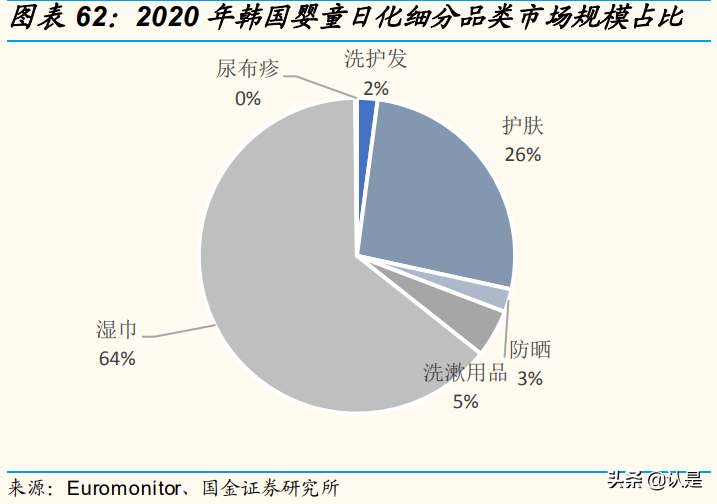 分品類看,據(jù) Euromonitor,我國嬰童化妝用品包含護膚、洗漱、濕巾、 洗 護 發(fā) 、 尿 布 疹 及 其 他 等 , 2020 年 市 場 規(guī) 模 占 比 分 別 為 39%/29%/20%/7%/4%/1%。