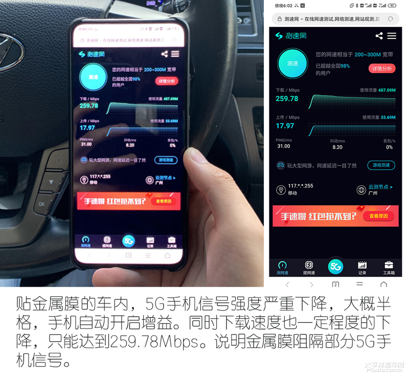 經(jīng)過車內(nèi)打電話、車外藍(lán)牙的連接以及5G信號和下載速度體驗測試,對手機(jī)信號有所阻隔。特別是在打電話時,手機(jī)自動把發(fā)射功率加大,導(dǎo)致整體電場和磁場數(shù)值有所增加,顯然對人體帶來隱形的危害。3M高端納米陶瓷隔熱膜「睦色系列」表現(xiàn)則比較,三個項目中均難以察覺有任何的信號阻隔,通話清晰、藍(lán)牙連接速度快。