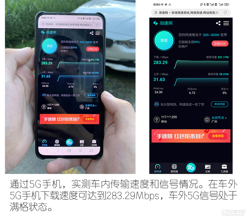 這個環(huán)節(jié)將采用四種的直觀方式進(jìn)行體驗測試,主要為車內(nèi)打電話判斷手機(jī)信號增益情況、在車外手機(jī)藍(lán)牙連接車機(jī)情況、5G手機(jī)下載速度情況以及ETC通過的情況。