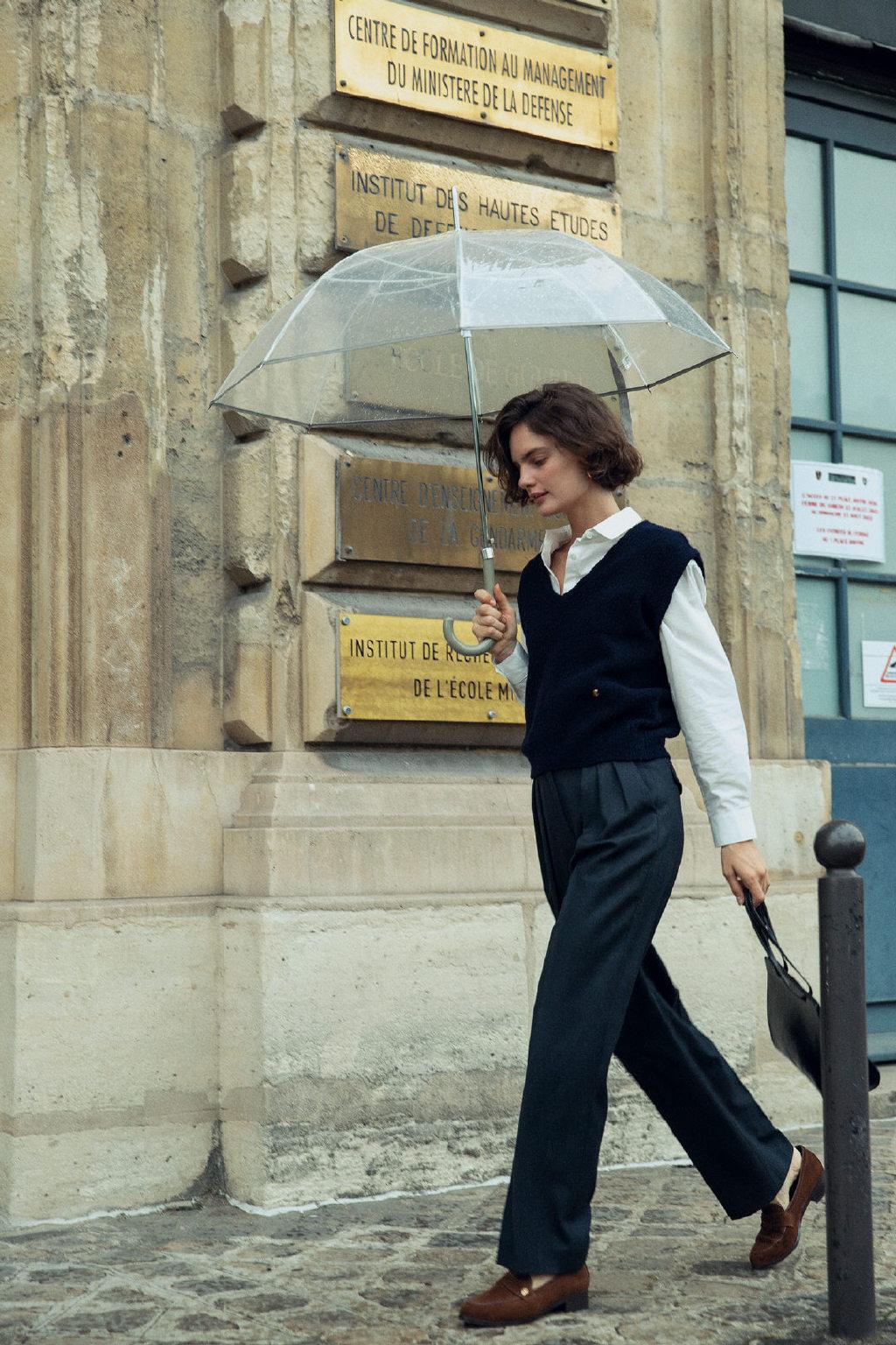 白襯衫搭配黑色馬甲,再來(lái)一條深色西褲,儼然一個(gè)中性人!于是,深棕色樂福鞋點(diǎn)綴,算是對(duì)優(yōu)雅有一個(gè)交待。