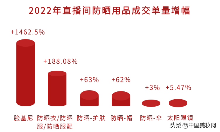 細(xì)分到各類防曬用品,被譽(yù)為“東方防曬術(shù)”的臉基尼跑贏整個(gè)市場,以1462.5%的直播間成交量增幅一騎絕塵,占領(lǐng)一位。再從各品類成交人數(shù)著眼,增幅第一的依然是防曬衣/防曬服/防曬服配。