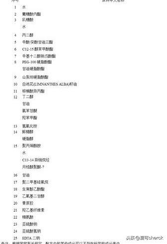 成分表只能參考下了。乳化體系共享165,哈哈。配方研發(fā)們你們自己考慮下為啥要用這個(gè)哈。第一因?yàn)楸阋它c(diǎn),第二他相對還是耐的住酸的。不過這邊可能還用了montanova 202 配合液晶乳化。只是猜測哈。乳化劑組合算丟丟了。