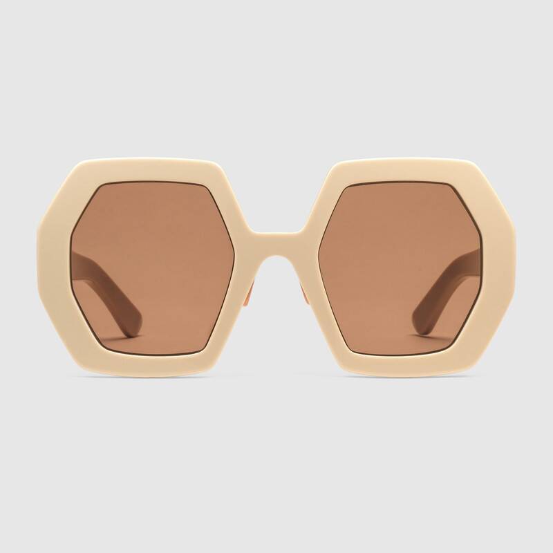 這款太陽(yáng)眼鏡采用超大造型的象牙白色醋纖鏡框,別致夸張的八邊形設(shè)計(jì)充分詮釋了本季倍加推崇的復(fù)古風(fēng)格設(shè)計(jì)。 鏡腿上匠心裝飾金色調(diào)金屬互扣式雙G細(xì)節(jié),彰顯不凡的品牌內(nèi)涵。
