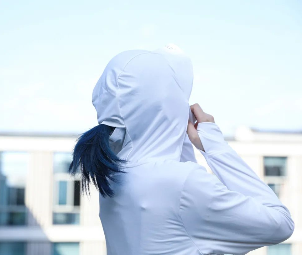 由于采用了全身冷凝鈦涼感面料,實際穿在身上站在太陽底下,能地感覺到一股涼意,給炎熱的夏天降降溫。