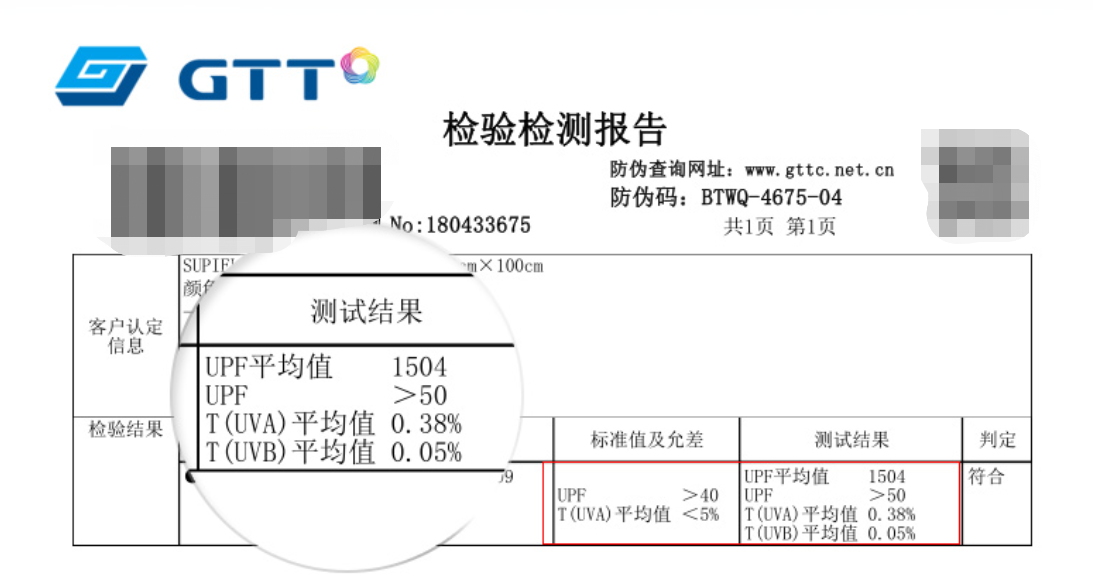 通過專業(yè)機構的檢測,衣服的UPF平均值超過了1500,而國標的要求是UPF大于40,超過了國標的37倍。