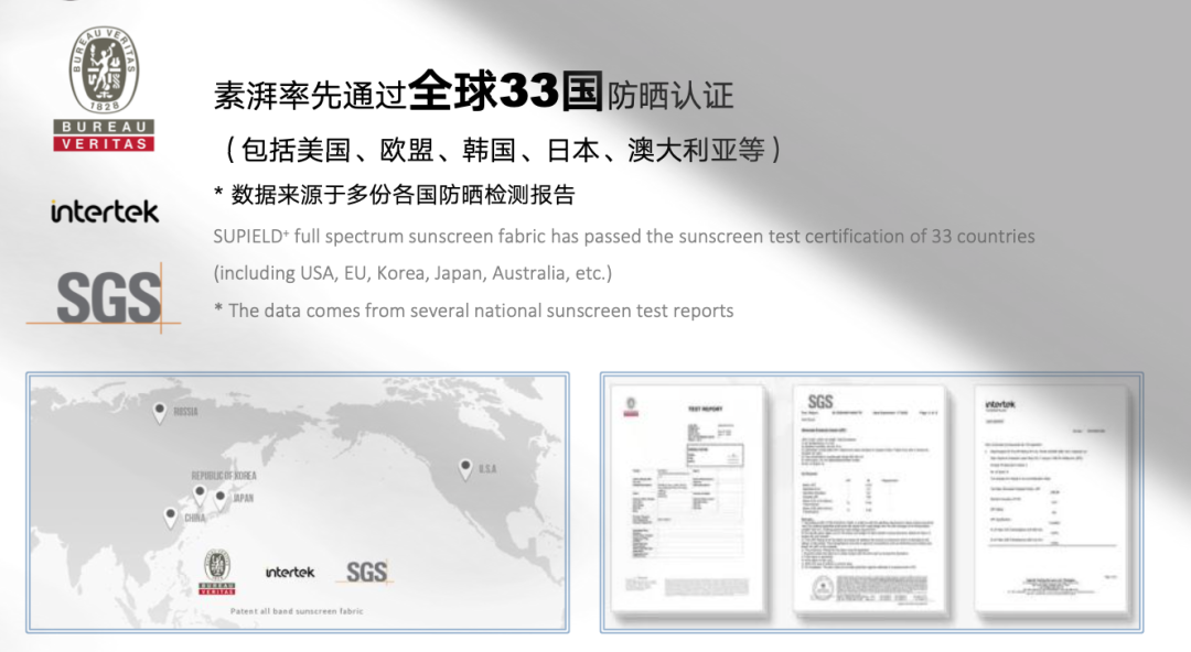 不僅如此,素湃防曬衣還通過了各種第三方專業(yè)測試機構的嚴苛測試,有BV、intertek、SGS等,并且在包括德、日、美等33個都通過了認證。