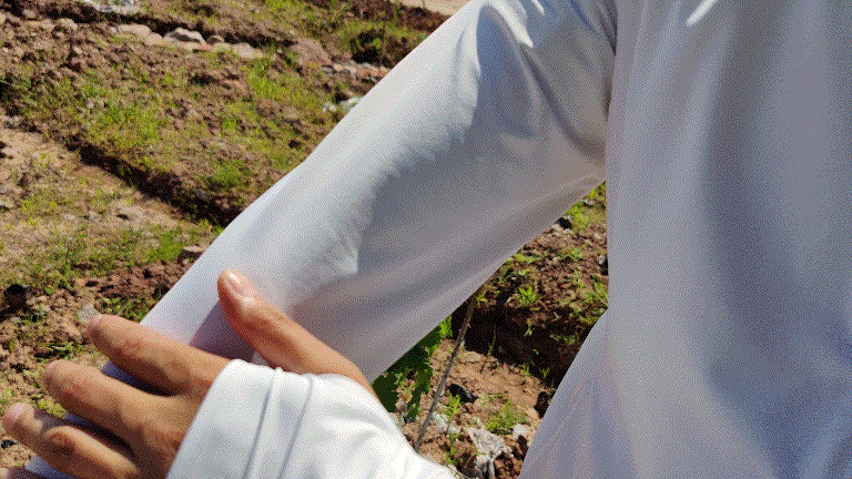 驚人的防曬果,UPF >1500素湃全波段防曬衣,采用了專利鈦防曬科技3.0,在面料纖維中加入了納米二氧化鈦(TiO2),其達到的果令人驚訝。