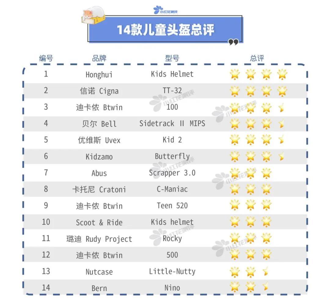 2.迪卡儂「Btwin」100(#3)、貝爾「Bell」Sidetrack Ⅱ MIPS(#4)、優(yōu)維斯「Uvex」Kid 2(#5)、「Kidzamo」Butterfly(#6)表現(xiàn)較好,都獲3.5星評分。