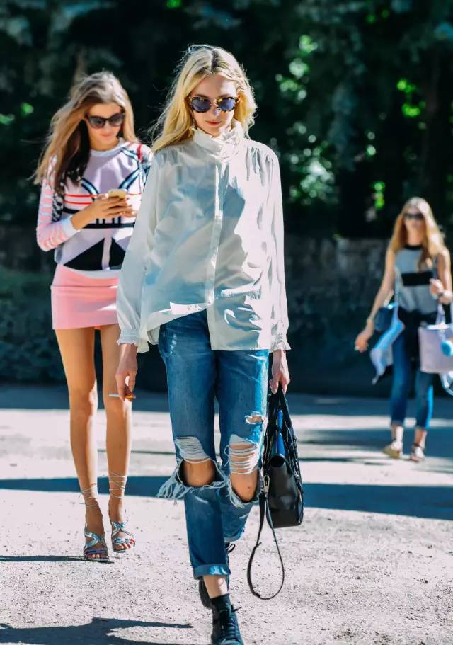 簡(jiǎn)約的白襯衫搭配破洞牛仔褲,配飾上鞋子與包包都選擇黑色系,讓藍(lán)白搭配更加清新耀眼。而貓眼豹紋邊框墨鏡則是點(diǎn)睛之筆,讓整個(gè)造型的逼格瞬間提升。