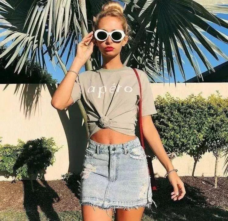 墨鏡+圖案T+休閑褲/牛仔裙